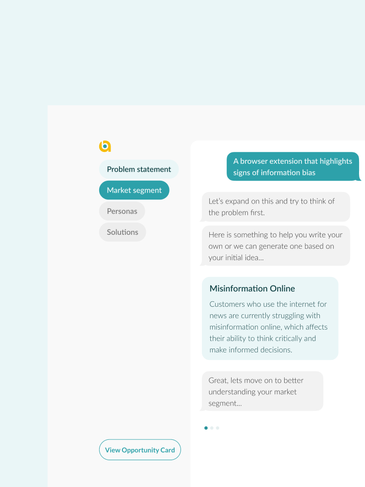 Alphabase is an innovative AI-powered tool designed to assist users in generating and refining business ideas. In a few short sprints, I worked alongside developers to create a simple experience using innovative AI UX patterns.